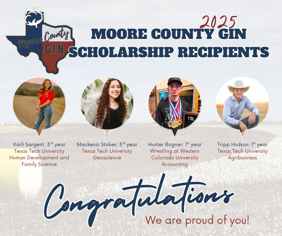 Moore County Gin, LLC began operations in 2005, offering quality ginning services to the cotton producers in Texas, Oklahoma, Kansas, and New Mexico. We have two complete gin plants which allow us to keep up with harvest in a timely manner. Thank you for your reliable patronage. We appreciate your confidence in allowing us to handle your cotton ginning and marketing needs.